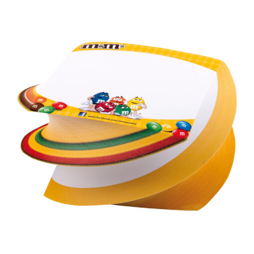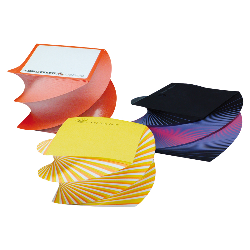 PromoKado maakte afspraken met zijn leverancier over de levering van een extreem opvallend kubusblok. Dit blok kent een waaier aan verschillende kleuren en zit in een spiraal dmv plakranden als 1 groot post-it blok aan elkaar vast. Eerst worden de blaadjes gedrukt en op stapel gesneden. Hierna worden de gestapelde blaadjes met een mal handmatig 180 graden gedraaid. Hierdoor onstaat de uitzonderlijke spriraalvorm. Na het draaien worden de blaadjes aan de kopse zijde in de draai verlijmd. Het mooie van dit unieke item is dat ieder blad nog eens bedrukt kan worden met uw logo of tekst. de aflopende kleuren bepalen het effect van het spiraalblok De gekleurde zijkant krijgt u er dus gratis bij.